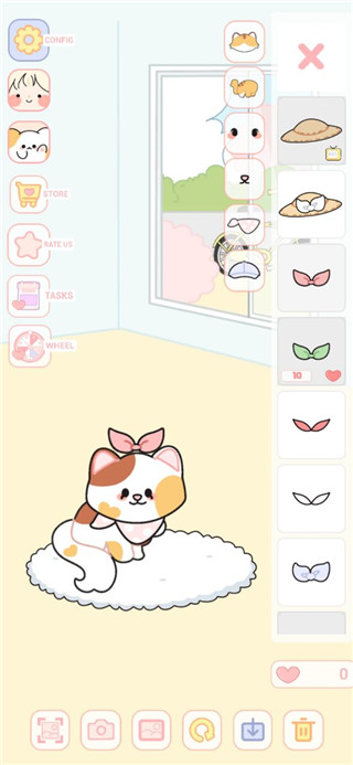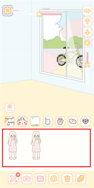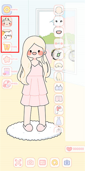 3.底部菜单从左至右依次为:创建场景、拍摄照片、打开画廊、重置娃娃保存、编辑或替换娃娃。通过金钱侧栏,能查看自己所拥有的“可爱的心”数量。