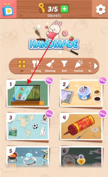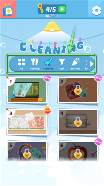 1.开启游戏后,玩家可自由挑选关卡,游戏界面上方设置了不同类别,涵盖烹饪、清洁等多种类型。