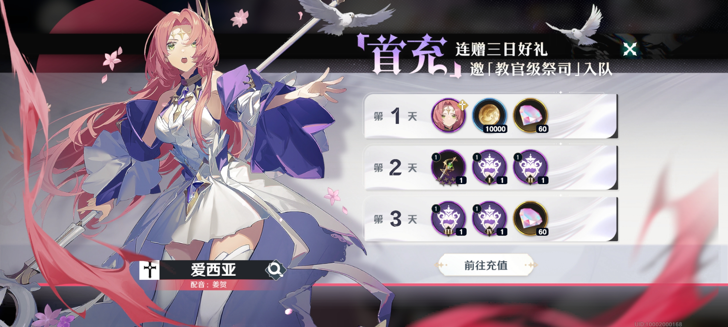 1.每日首充活动极具性价比,连续三天参与,每日仅需充值最低档6元,就能将祭司角色爱西亚、4星治疗武器、金币、星钻、刻纹等丰厚奖励全部收入囊中。