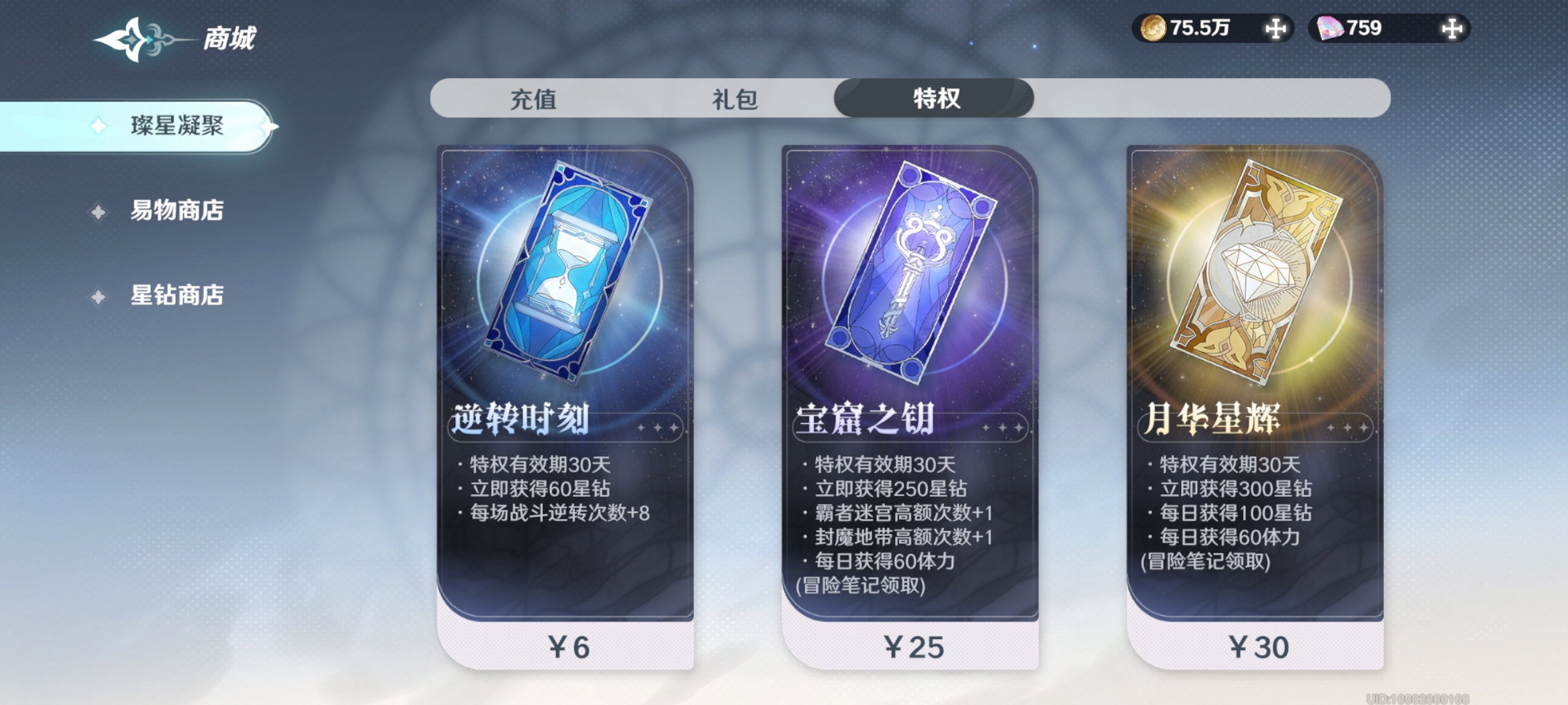 5.月卡是微氪和平民玩家的好选择,有逆转时刻、宝窟之钥、月华星辉三种。逆转时刻可在挑战关卡失败时返回部分操作继续游戏;宝窟之钥增加特殊副本挑战次数;月华星辉每天可领星钻。