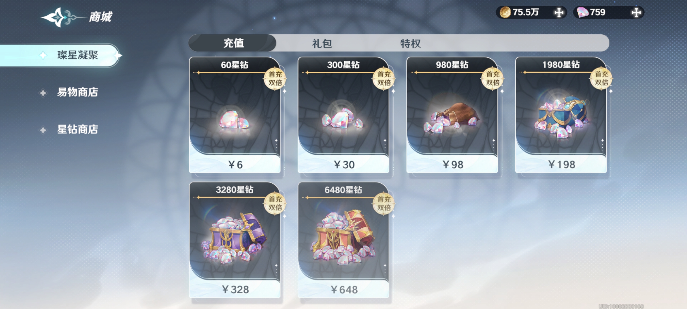 3.首充双倍福利不容错过,首次充值6、30、98、198、328和648这几个档位时,均可获得双倍星钻奖励,让充值效益最大化。