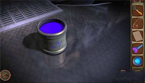1.前往左边有黄色灯光的楼梯处,点击后可获取一个手电筒;再点击右边发蓝光的地方,能得到一个镜头,同时用手电筒蘸取一些蓝色液体。