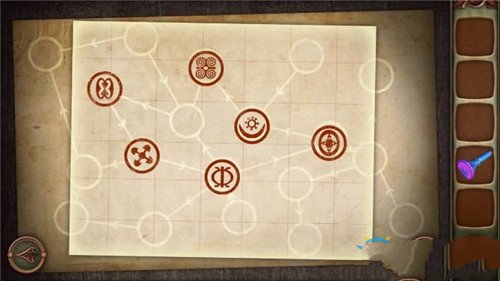13.下楼梯后点击门,按照图纸上箭头的指示,将6个图形调整到相应顺序,中间圆为出发点,前5个图形顺序正确的话,把最后一个标志换成4个螺旋的圆圈标志,点击门即可通关。