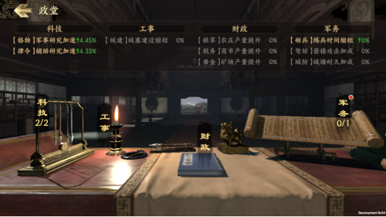 官府治世(处理政务)之所,主公可前往政堂,通过任命武将来处理城中政务,获得各类加成。可任命的官职种类,随政堂等级提升而解锁,政堂等级越高,解锁的官职种类越丰富,任命武将后可获得的加成也就越多。