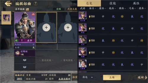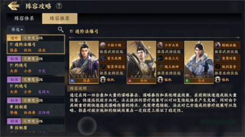 2.法爆:法爆体系可克制连击体系,注重前期输出最大化。它能在同一回合叠加状态效果,释放大量伤害技能,像郭嘉降低敌方谋略防御,法正增加己方谋略暴击与暴伤,再配合孙权或司马懿的谋略伤害爆发。还可携带前期收益高的技能强化输出,如【冰冻三尺】【陇上妆神】,快速压低敌方血线,但面对高减伤、高回复的敌军队伍时较难取胜。