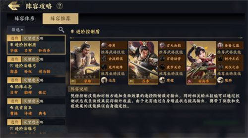 4.控制盾:控制盾体系克制携带大量主动技能的队伍,通过控制和减益效果限制敌方输出,如甘宁的眩晕、吕布和周泰的沉默以及周泰的减伤,同时利用技能连携效果,实现每个回合平稳输出伤害。