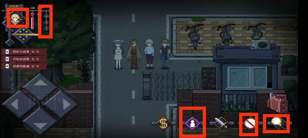 进入地图后可以先点左上角头像,设置一下操作模式然后关闭自动切换角色。我个人觉得摇杆比较方便,关闭自动切换是方便跑图。旁边的三个小框序章用不到,但是第一章就比较需要了,有一说一,蛮容易忽略的;右下角的图标第一个是交易,就是队内协调物资用的,每个人物的行动轮能用一次,第二个是和左上角的三个小标做联动的相关判定位,序章用不到,第三个是战斗键,打架用的,会经常用到但是打一下就三点行动点,要注意;第四个是结束人物的行动轮,小心别误触;第五个调查按钮,开关门之类的经常用。上面那个就是每个人物的背包了。