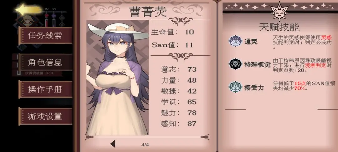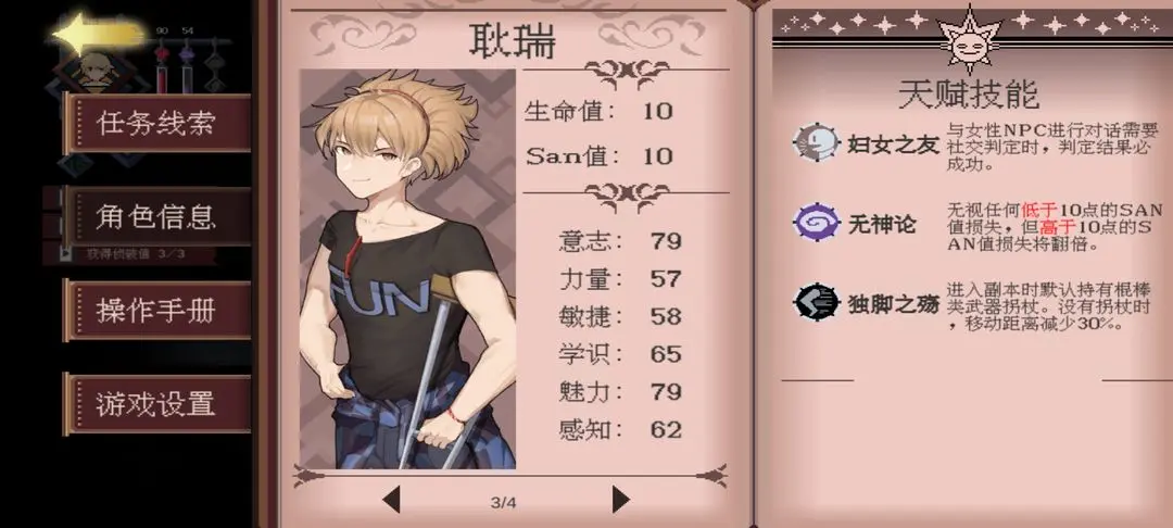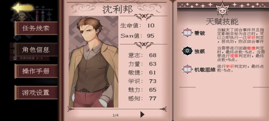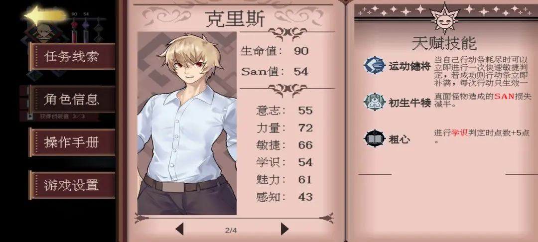 看角色信息可以了解各个人物的技能我也会把截图放在下面,克里斯跑图超级快,耿瑞对女性社交有特攻,曹菁荧的灵感也是百分百成功在第一章超有用。