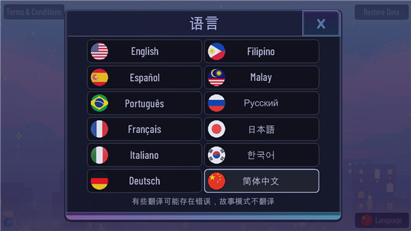 2.成功进入游戏主界面后,点击左下角位置,可对游戏部分语言进行更改设置。