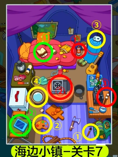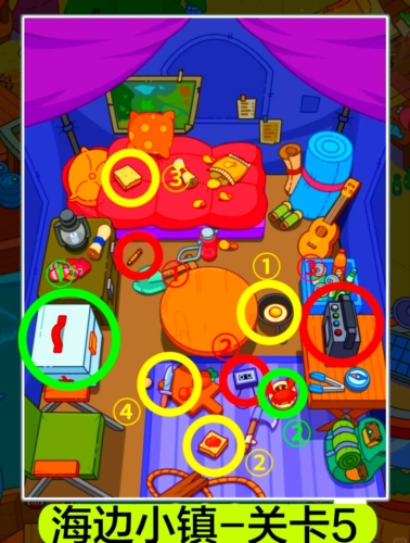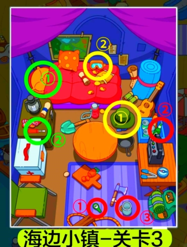 2.关卡3酒吧挑战:红圈处,用开瓶器开啤酒倒进杯子;黄圈处,将帽子下的呼吸管组合成潜水镜;绿圈处,用螺丝刀撬开枕头下的贝壳取珍珠。