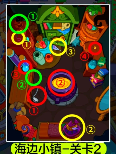 1.关卡2厨房秘密:红圈处,拿勺子舀水倒进瓶子,合成塞子后点击;黄圈处,用针线缝补帽子,再用羽毛装饰成新帽子;绿圈处,从头盔下拿出钥匙打开抽屉找宝贝。