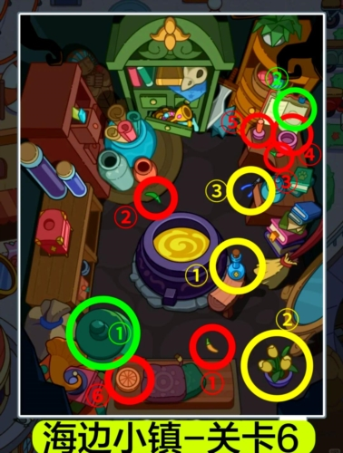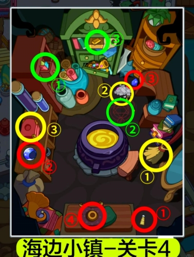 3.关卡4水晶魔法:红圈处,给水晶球涂胶水,拼合碎片后放上底座;黄圈处,用扫帚扫开垃圾堆,打开盒子拿宝石;绿圈处,用水晶和金块合成皇冠。