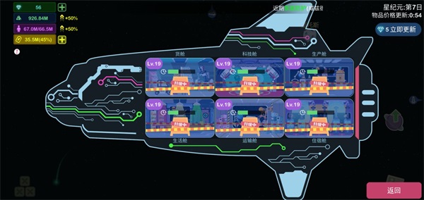 2.主舰升级很关键,别因运输需求就只升级货仓和运输仓。实际上,我不囤货后运输基本闲置,只需运输市场所需物品。生产仓和科技仓才是重点,生产仓决定能否制作高利润商品,科技仓不足会影响任务和材料获取。我开始没升生活仓与住宿仓,等级落后,后来花不少钻石才跟上。
