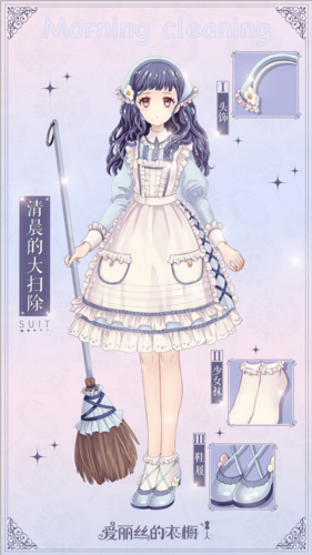 1.清晨大扫除主题的裙子充满女仆风格元素,和常见的粉白、黑白搭配不同,浅蓝色搭配白色围裙是爱丽丝的经典配色。这种配色带来的代入感,源于《爱丽丝梦游仙境》里爱丽丝的标志性装扮,让人看到纯色蓝裙配白围裙,就仿佛看到了爱丽丝。