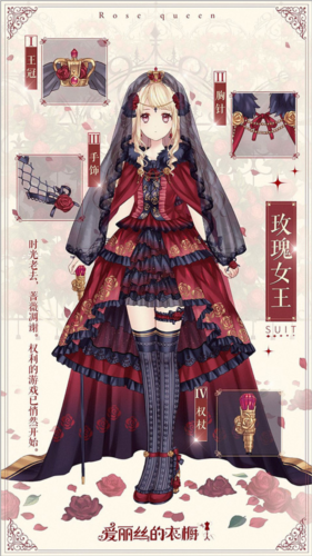 2.玫瑰女王主题的服装,与女主配色差异明显。作为大反派,红桃女王的裙子以红黑配色为主,还融入了一些卡牌元素,这是爱丽丝风格裙子的一大特色。