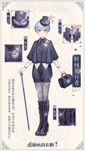 3.时间旅行者主题中,白兔先生相关的王子装很有特点,礼帽、时钟、小箱包是常见元素。值得一提的是,王子装并非男生专属,女孩子也能穿,其特点是燕尾服搭配灯笼裤。