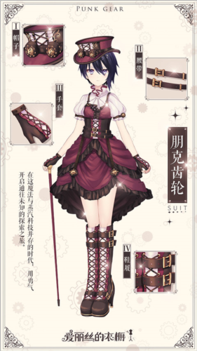 4.齿轮朋克主题的服装是经典的蒸朋lolita风格,它诞生于维多利亚时期,以科技飞速发展的工业时代为背景。皮革、腰封、繁复裙摆以及齿轮等具象元素相互碰撞,展现出一种乌托邦式的美好,是先进科技催生的“机械化暴力美学”,与赛博朋克的消极悲观不同,它充满浪漫主义乐观精神。