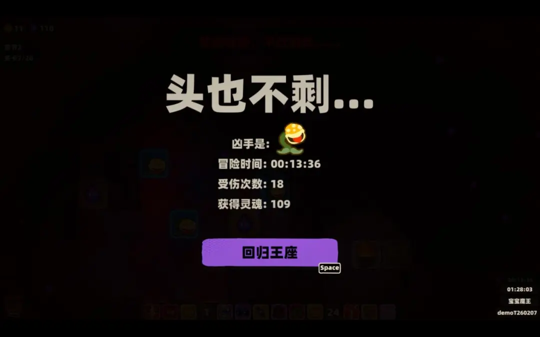 友情提醒,npc母鸡不要刻意去击杀,否则你就会提前面临一场boss战,1图的隐藏boss感觉,正式版也有可能给这个玩意出个成就,奖励是啥暂时不知道,因为手贱开了发现数值有点高,demo的局外拉满加上图1一开始的成长并不支持我击败这玩意。