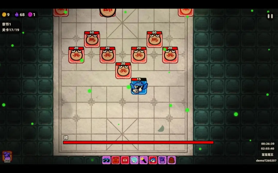 象棋boss,跟象棋规则一样,不过少了炮跟相,难度下降不少,不排除后续难度会增加,可以将小弟全部清掉,将并不会进行攻击,也可以越过小弟直接击杀boss,然后boss战就算胜利了。