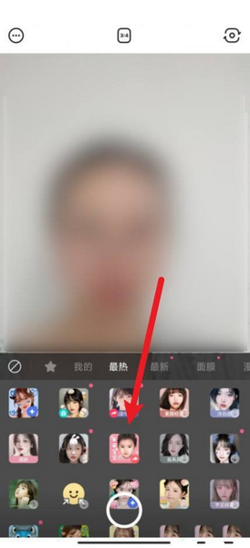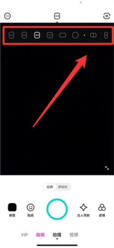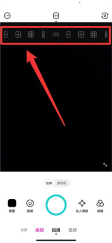 2.点击该图标后,可看到不同拍摄比例选项,向右滑动屏幕,众多拼图效果便会呈现出来。