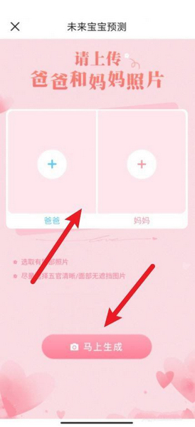 4.按提示依次上传两张照片,随后点击“马上生成”,就能得到合成结果。