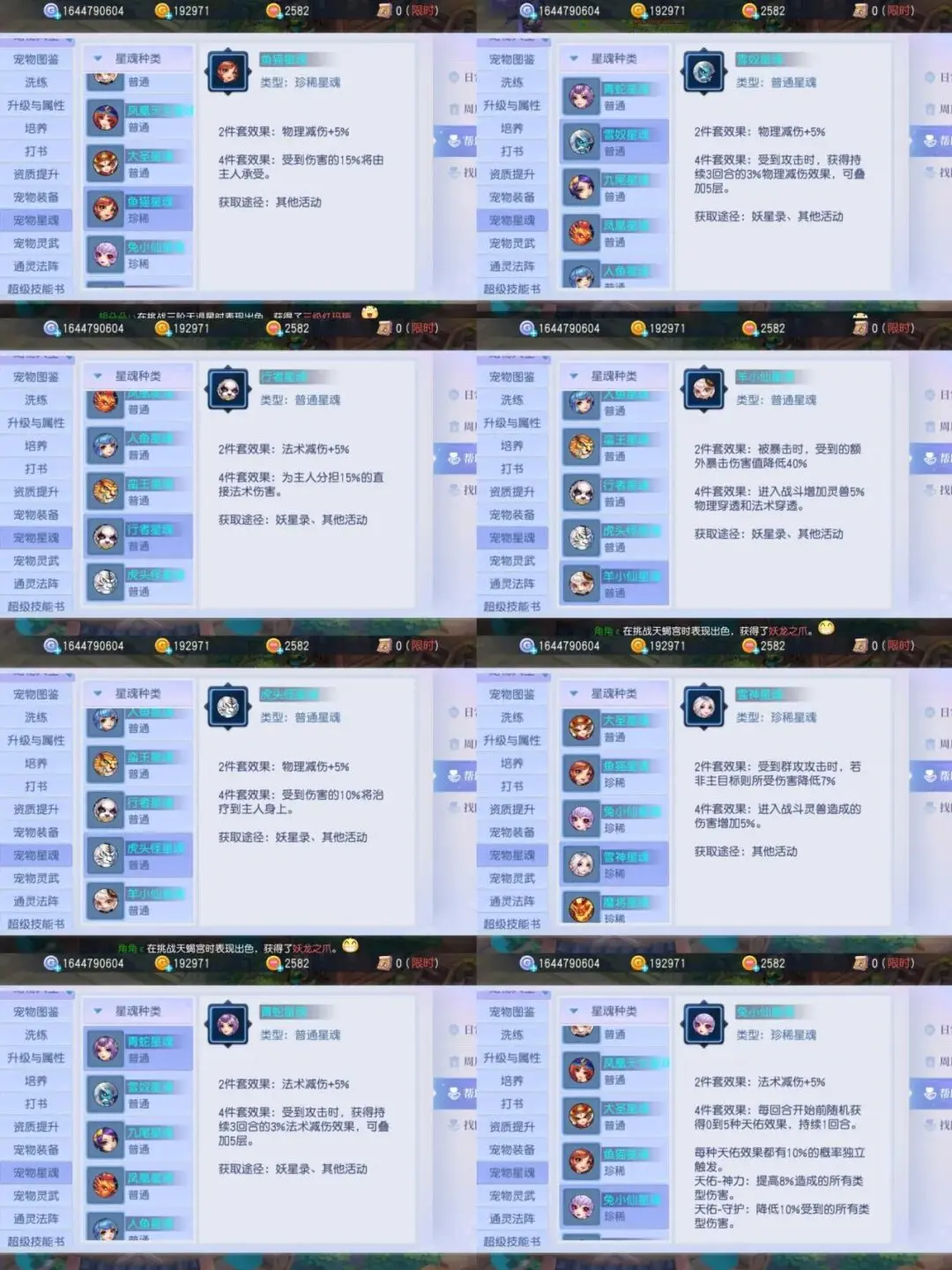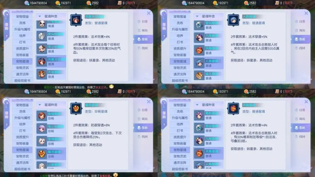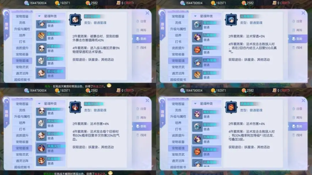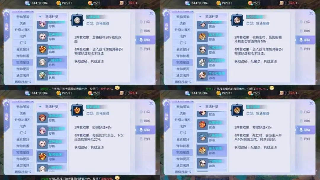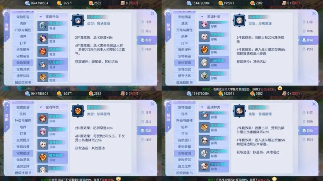 辅助宠物星魂选择简单。有条件玩家优先考虑鱼猫和嘲风四件套;条件有限则选极致物防或法防组合。