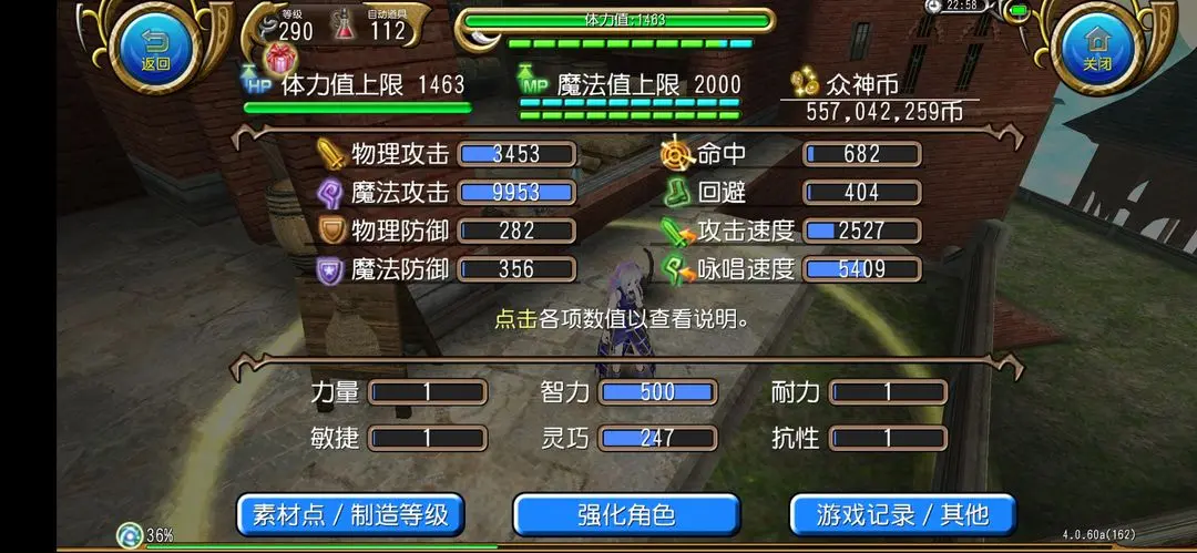 智力500,灵巧247,副灵巧堆咏唱可大幅提升灵活性,且灵巧给魔攻,伤害不会低太多。日常环境可打暴击(开稳定后有174暴率,43法术暴率,帝王衰弱后有130法术暴率,可打低抗暴),高抗暴环境可打白字,无需硬堆暴击率。追求伤害可将主手武器换成法杖。