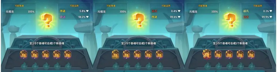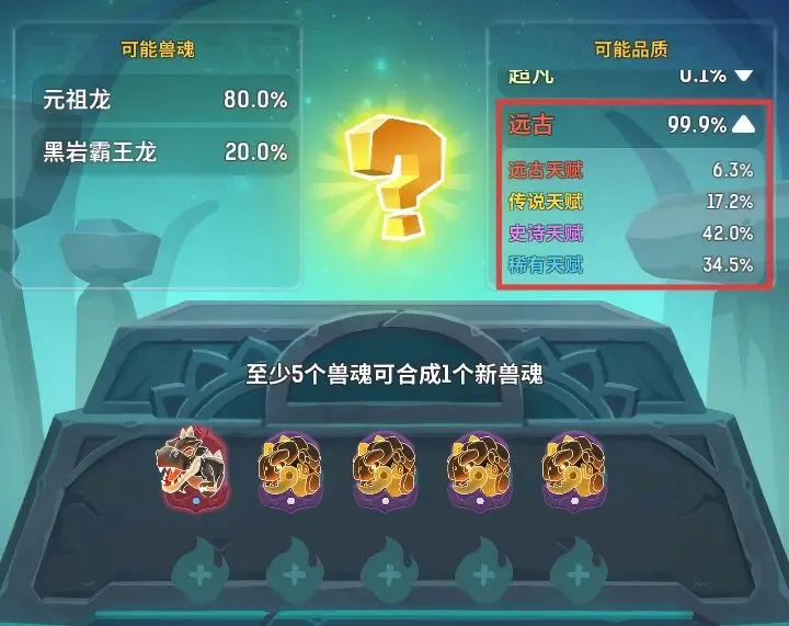 合成兽魂有三条核心规则要牢记。种子规则是合成高级兽魂,材料里得有至少1个低一级形态的种子,比如合成“元组龙 - 远古”,就得放至少1个“元组龙 - 传说”。种类锁定规则是产出兽魂类型由材料中占比最高的同名兽魂决定,像放3个“元组龙”和2个“黑岩霸王龙”,大概率产出“元组龙”。保底机制是合成只有晋升成功和触发保底两种结果,不会材料全消失。