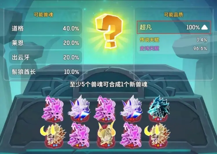 这阶段核心目标是快速扩充传说级兽魂库。操作公式是5个任意史诗兽魂合成1个随机传说兽魂,10个任意传说兽魂合成1个随机远古兽魂。执行策略是不挑种类,把闲置、非核心的史诗兽魂都拿去合成,用数量堆基础,为定向合成攒种子。上阵策略就是有啥用啥。